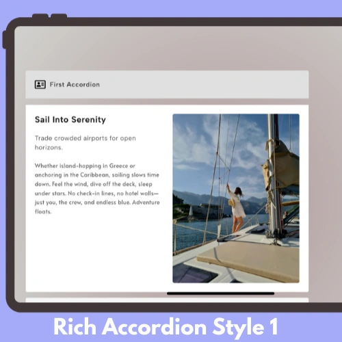 Build an FAQ section where each answer includes a supporting image. Create a service breakdown accordion with embedded explainer videos. Display feature comparisons with rich text on the left and screenshots on the right. Use it for a step-by-step tutorial layout with media per step. Present product specs alongside demo clips — and many more content pairing use cases.