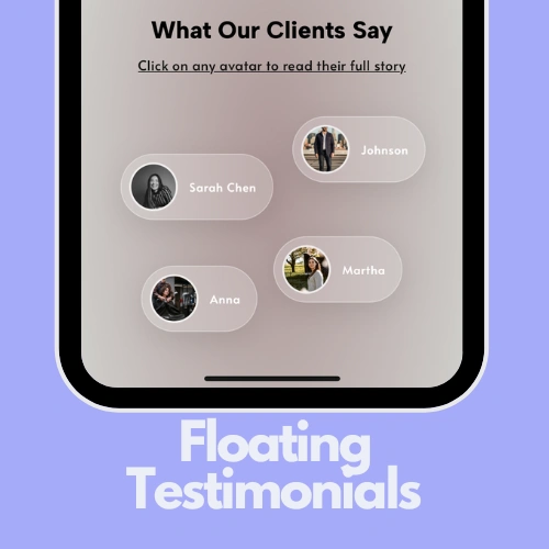 Float customer testimonial avatars across a hero section to create a living proof wall. Display client logos as floating pills with full review modals for agency trust sections. Animate team member endorsements across a about page for coaching businesses. Feature verified buyer bubbles on an e-commerce product page. Show patient testimonials as gentle floating circles on a healthcare website – and many more social proof display scenarios.